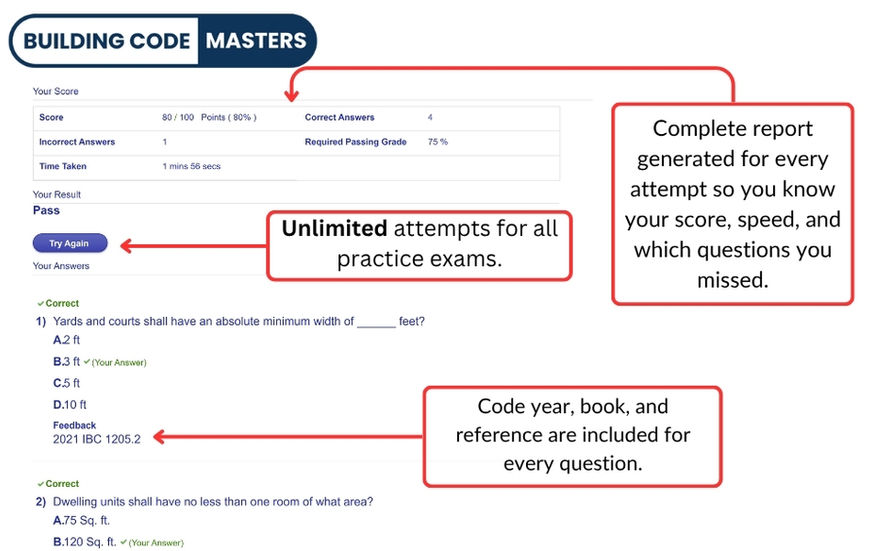 This online practice exam course is designed for the 2021 Residential Building Inspector, B1 certification exam from the ICC. Test yourself on the most important areas of the code and learn the answers to some of the most challenging code questions with the practice exams in this course. Included in these practice exams are the keys to understanding how to take the real code exam. Completing multiple practice questions is essential for passing a building code examination and the best way to eliminate taking the ICC exam multiple times. Practice exams include: - 152 Total questions - 1 Large practice exam with all of the test bank questions - 1 Full practice exam with the same number of questions as the real exam - 1 Timed full practice exam with the same number of questions as the real exam - Code references for every question - Automatic question shuffling - Automatic grading Practice exams cover: - General Administration - Building Planning - Footings and Foundations - Floor Construction - Wall Construction and Coverings - Roof/Ceiling Construction - Public Safety and Special Construction Material required: - 2021 International Residential Code